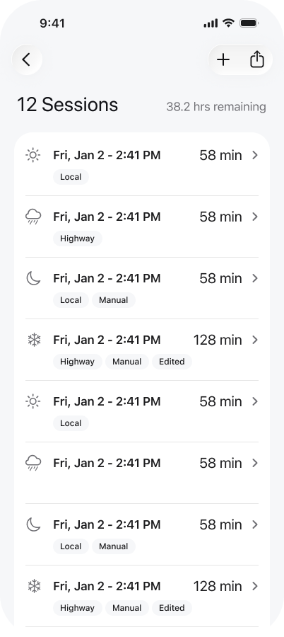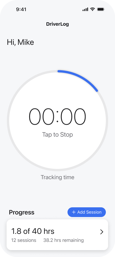 Start and stop a driving session with a tap. The time is recorded automatically. No pressure. No penalties. Just accurate time tracking.
