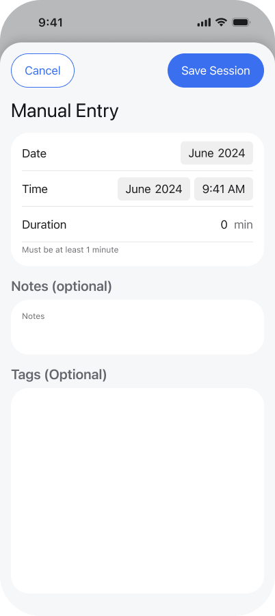 Forgot to start the timer? No worries! We’ve made it easy to quickly add a session manually in seconds.