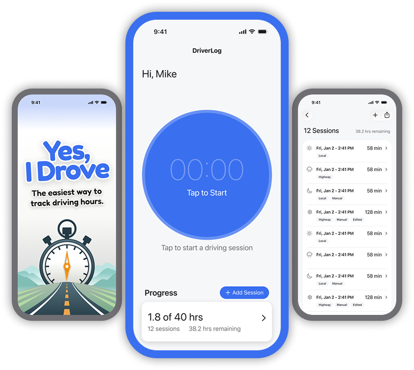 Yes, I Drove helps student drivers and parents record sessions in seconds, stay organized, and feel confident about progress. Start a session, stop when you’re done, and you’ve got a clean record of your driving time—no spreadsheets, no stress.
